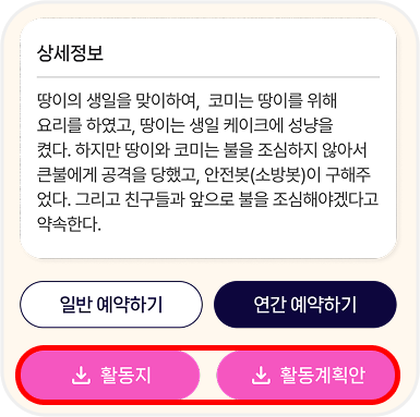 A. 이야기극장 톡톡의 경우, 상품 상세 페이지 맨 하단에 버튼을 통해 활동지와 활동계획서 파일을 다운로드할 수 있습니다.