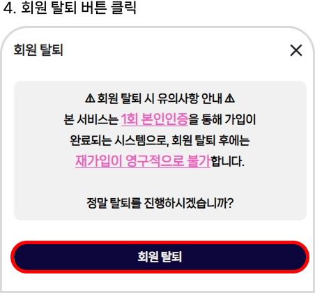 A. 회원 탈퇴 시 재가입이 영구적으로 제한됩니다. 가급적 소속기관 해지 기능을 사용해주시기 바라며 회원 탈퇴는 신중히 결정해 주시기 바랍니다.