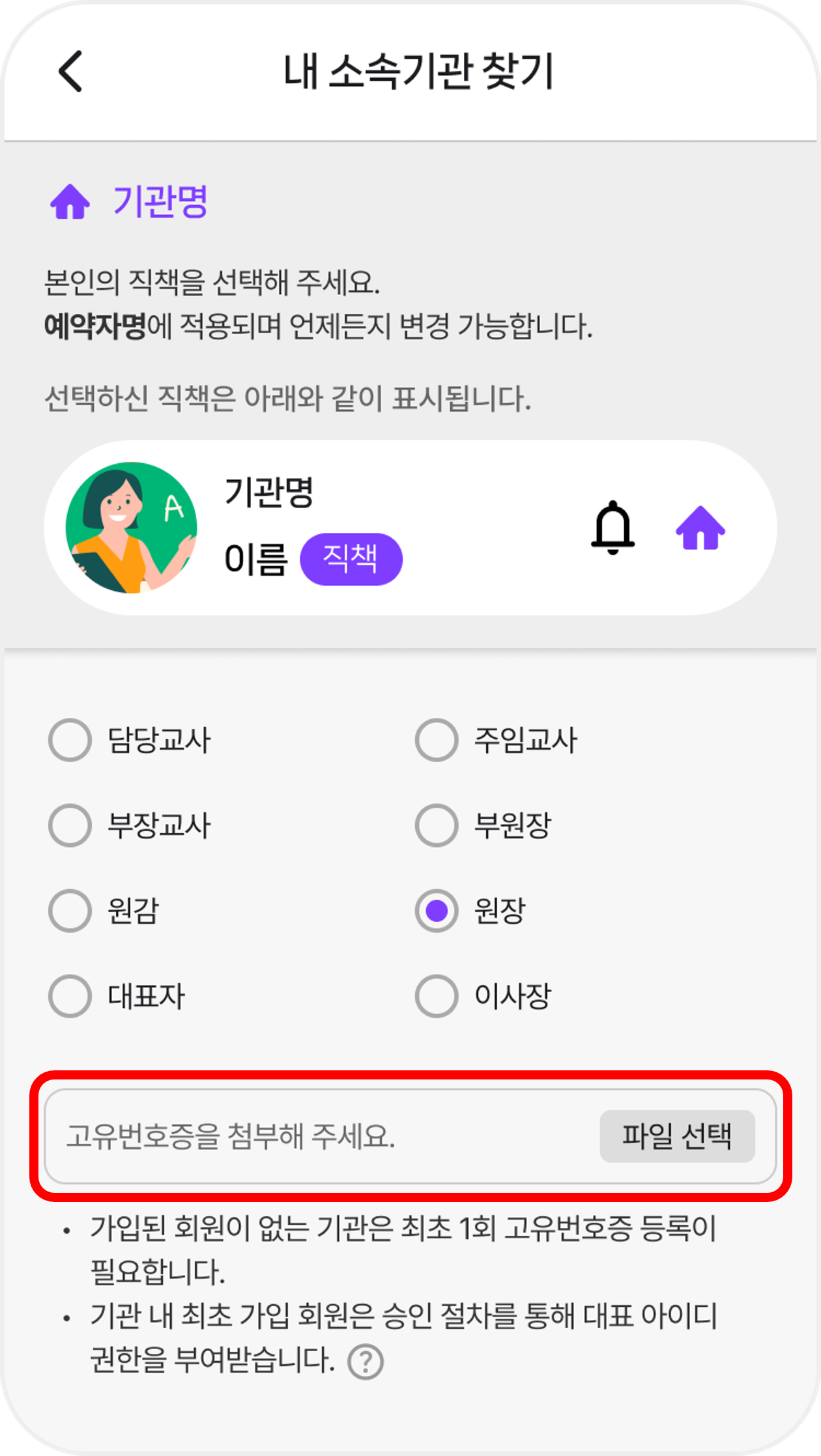 1. 다른 기관 소속 추가는 [내 정보 > 소속추가 > 내 소속기관 추가 > 직책 설정]에서 가능하며, 최초 가입 시에는 증빙 서류가 필요합니다.