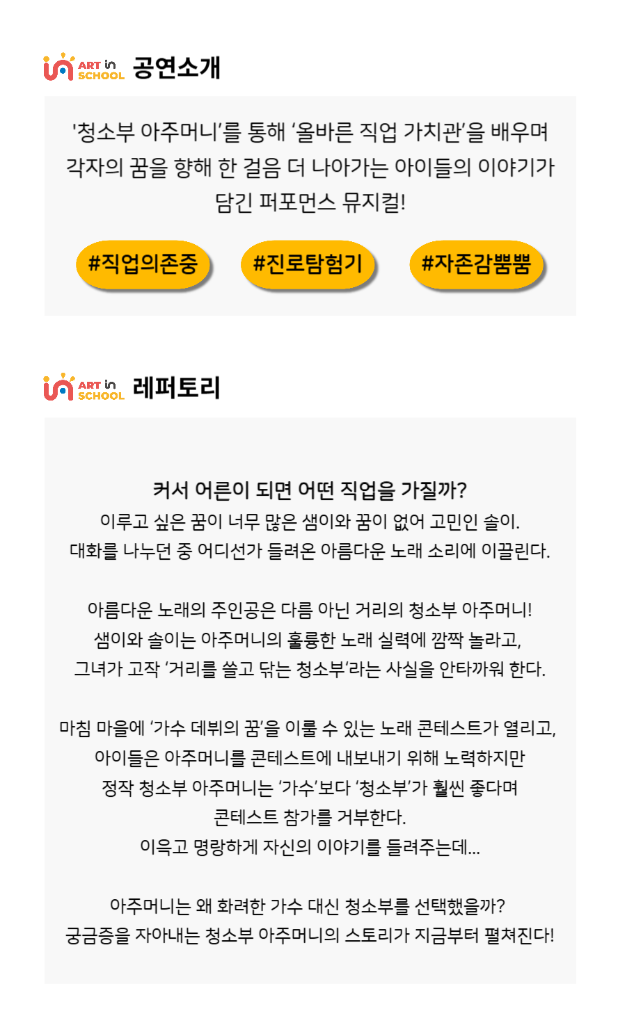 ’청소부 아주머니’를 통해 ‘올바른 직업 가치관’을 배우며 각자의 꿈을 향해 한 걸음 더 나아가는 아이들의 이야기가 담긴 퍼포먼스 뮤지컬.