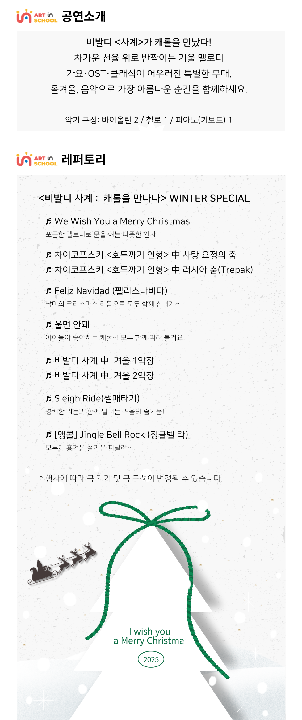 비발디 사계를 테마로 진행되는 음악회로 짧게 편곡한 클래식 곡과 유명 가요를 통해 사계절을 음악으로 느껴보는 클래식 음악회