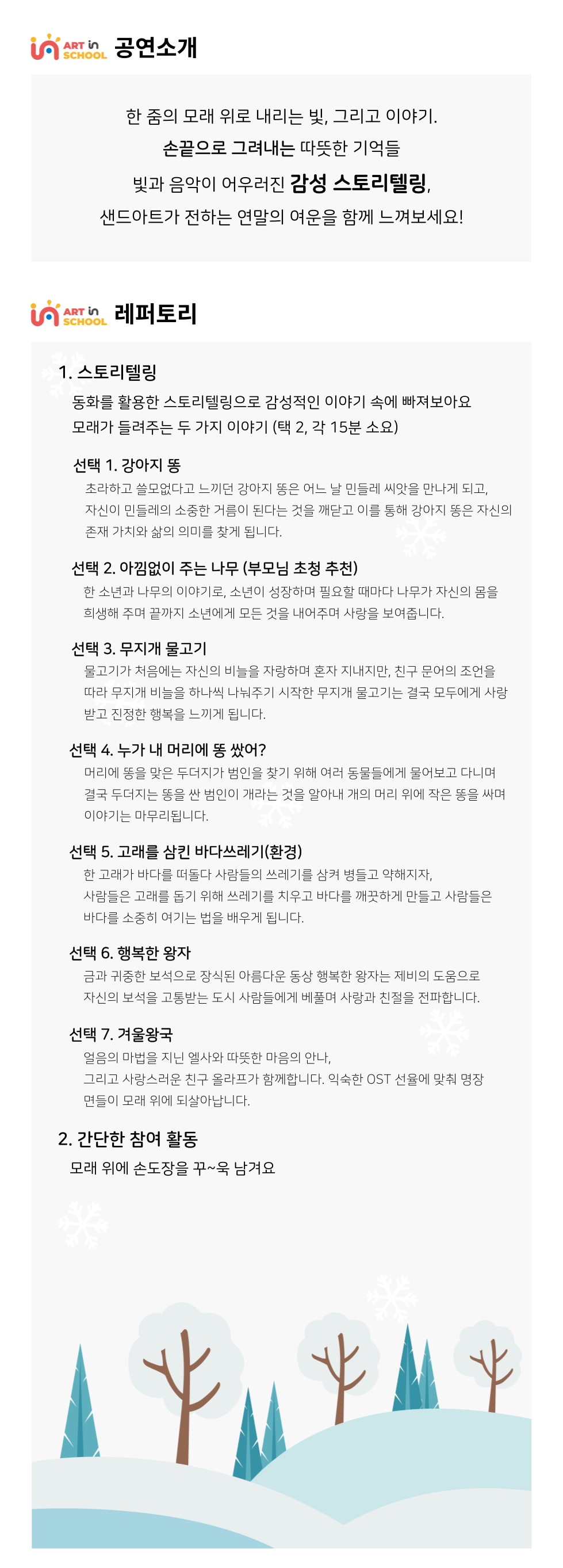모래 위에 동화를 담아 신비롭고 아름다운 이야기를 들려줍니다.